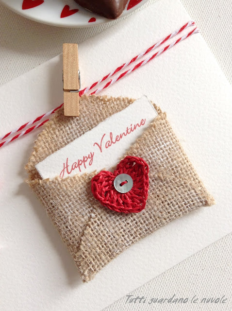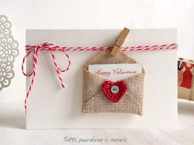 bustina di carta, rafia rossa, uncinetto, cartoncino bianco,